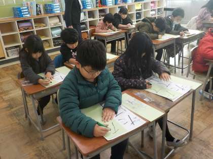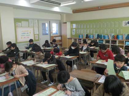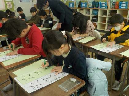 今日は書き初め大会がありました。冬休みの練習の成果を発揮しようと、朝からやる気に満ち溢れていた子供たち。姿勢や持ち方等に気を付けながら集中して取り組んでいました。
