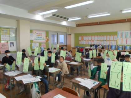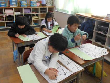 冬休み中に一生懸命に練習したのでしょう。みんな真剣に集中して「書き初め」を行いました。名前までしっかり書く姿に、3学期のやる気を感じました。