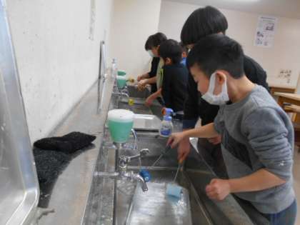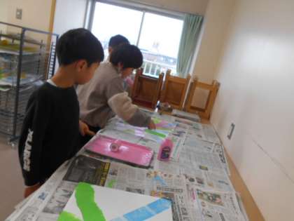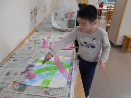 「たのしいな 〇〇のせかい」のシール版画の下地づくりにカラーインクで色をつけました。子供たちは、「〇〇なせかい」を思い描きながら3色から4色の下塗りを行いました。後片付けもきちんとできた2年生です。この後、シールに思い思いの絵を仕上げていきます。仕上がりが楽しみです。