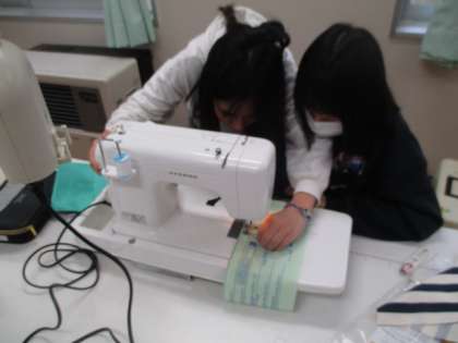 家庭科の学習で、練習布を使用してミシンの使い方を練習しました。そしてその学習を生かし、現在はウォールポケットの製作をしています。寸法や表裏に気を付けて協力して作業しています。