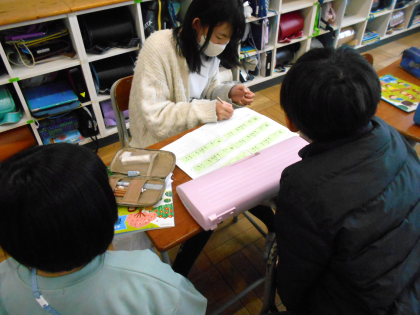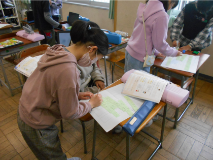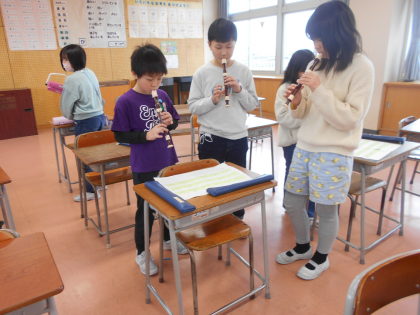 音楽の学習で、グループに分かれて6小節の日本の旋律をつくっています。相談して決めた旋律を、リコーダーや鍵盤ハーモニカで演奏することを目標に、練習しています。