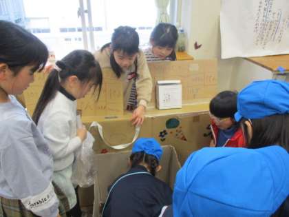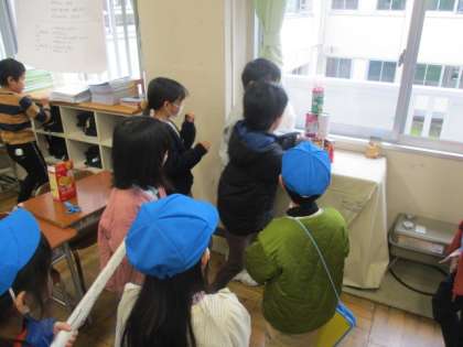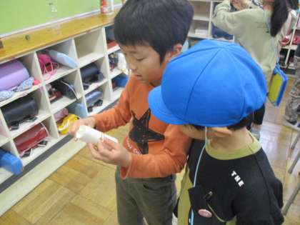 先週、2年生からおもちゃランドへ招待されました。1年生は2年生のお兄さん、お姉さんにやり方を教えてもらい、とても楽しく手作りおもちゃで遊んでいました。「来年はこんなおもちゃを作ってみたい」と2年生になることを楽しみにしています。