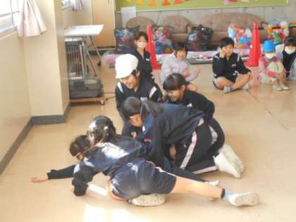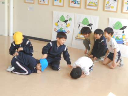 表現遊びでは、4枚のカードに書かれている「ことば」から起承転結の物語をイメージして、動きをグループで話し合い、工夫して力を合わせて表現していました。