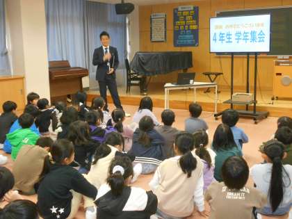 始業式後、学年で集まって学年開きをしました。担任の先生クイズは大盛り上がりで、その後学年目標や行事の説明などをわくわくした表情で聞いている子供たちでした。