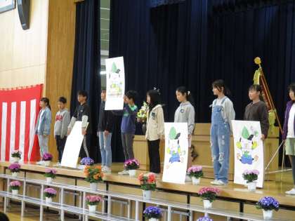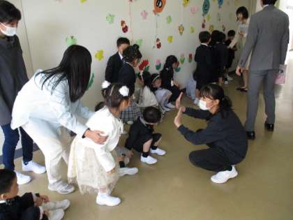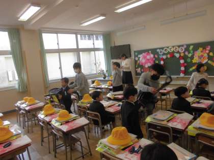 6年生は入学式の準備、手伝いをしました。受付では保護者の方を各教室へ誘導したり、教室では1年生に優しく接し、準備を手伝ったりしていました。入学式の学校紹介では、代表児童を中心に、マスコットキャラクターのはじめちゃんを紹介しました。月曜日からは1年生が登校してきます。最高学年つぃて常に手本となれるように、やる気満々の様子でした。