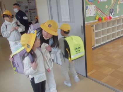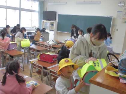 入学式後初めて登校する1年生に、ランドセルから教科書や連絡帳を出して帽子をランドセルの中に入れたり、水筒や上着をどうやって片付けるのか優しく伝えたりしました。
