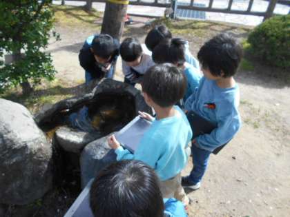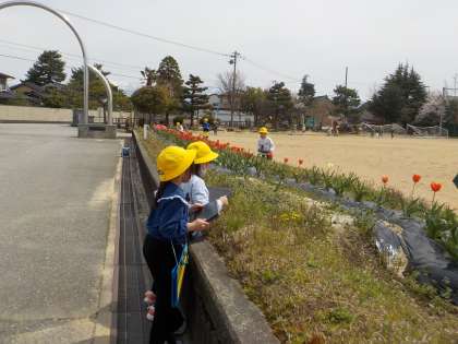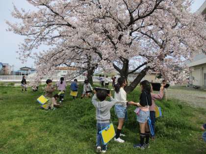 新庄小学校にある春を見つけにいきました。春になってたくさんの花が咲き、生き物がいることに気づいていました。これから国語や図工の学習で、見つけた春を絵や言葉で表現していきます。