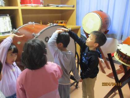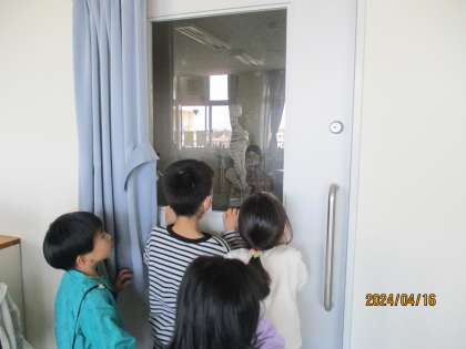 学校の中を探検し、楽器や理科に使うものなど興味津々に見ていました。