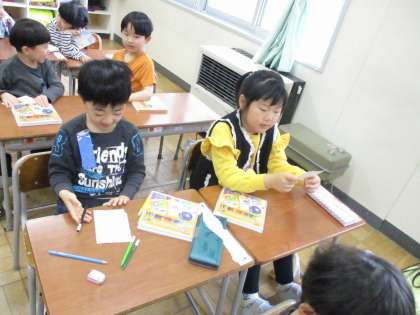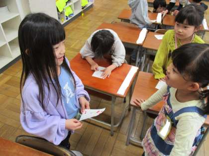 名刺をつくり、クラスのお友達に渡しました。両手で受け取り、「よろしくね」とにっこにこに笑っていました。