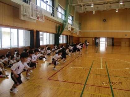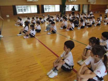 今日は、初めて体育館で運動をしました。並ぶときの姿勢や「いちについて」「どん」のときの姿勢を練習し、かけっこをしました。