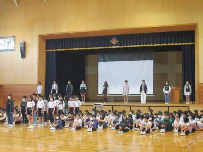 児童会発足式を行いました。今年度のスローガンは『きらめけハッピースター!つながれ新庄っ子の輪』です。みんなで力を合わせて、よりよい新庄小をつくっていってほしいです。