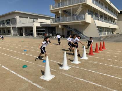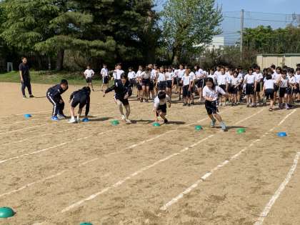 体育科の時間は、毎時間様々な「走力アップトレーニング」に取り組んでいます。ドリル練習だけでなく、鬼ごっこやリレーなど、全力で走ったり仲間を応援したりしています。