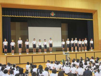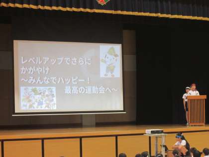 結団式を行いました。今年の運動会のスローガン『レベルアップでさらにかがやけ〜 みんなでハッピー!最高の運動会へ 〜』の発表の後、団役員の紹介がありました。5月18日(土)の運動会に向けて、やる気を高めた新庄っ子です。