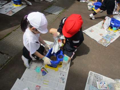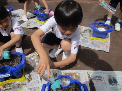 いい天気に恵まれ、あさがおの種を植えました。元気な花が育ってほしい、きれいな花を咲かせてほしいなど、それぞれが思いをもち、水をあげていました。