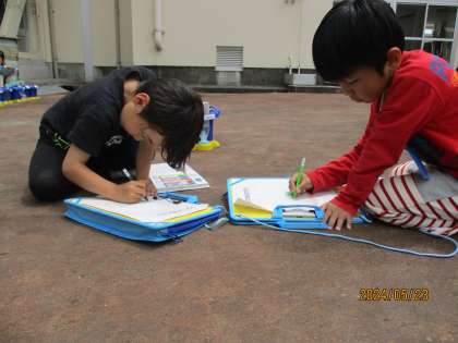 あさがおの芽が出て、子供たちは大喜び。どんな葉っぱなのかよく見て観察しました。