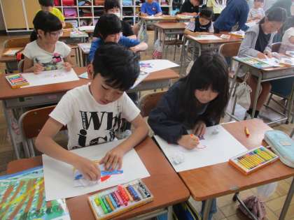 クレヨンを使って自分のすきなものを描きました。友達の作品を見ながら感想を伝え合う姿も見られました。