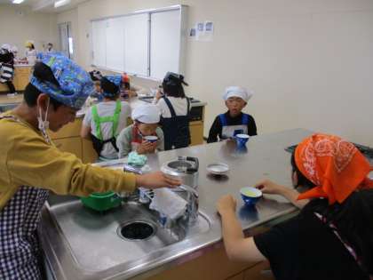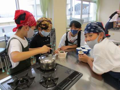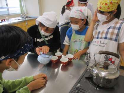 お茶をいれる実習をしました。普段飲み慣れない煎茶でしたが、「おいしい」とおかわりする子がたくさんいました。あちこちから笑い声が聞こえてくる、楽しい午後のひとときを過ごすことができました。