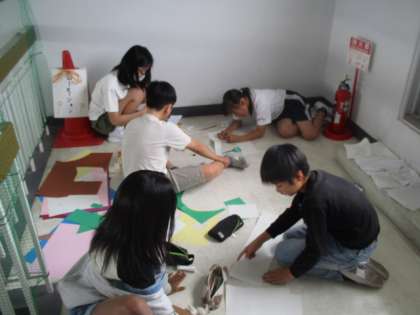図工では、場所のおく行きを使って、楽しく見えるものをつくりました。形がつながるように、画用紙の形や大きさを工夫してつくりました。