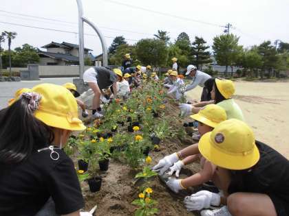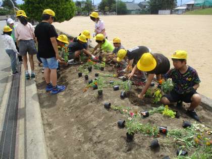 各クラスでデザインを考え、玄関前の花壇に花を植えました。グリーンキーパーさんにも来ていただき、花の植え方を教えていただきました。これからお世話を頑張ろうと張り切っている4年生です。
