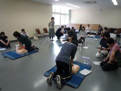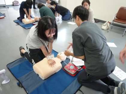 PTA役員の方も参加してくださり、いざという時に備えて、胸骨圧迫や人工呼吸、AEDの操作等、実技を交えながら学びました。