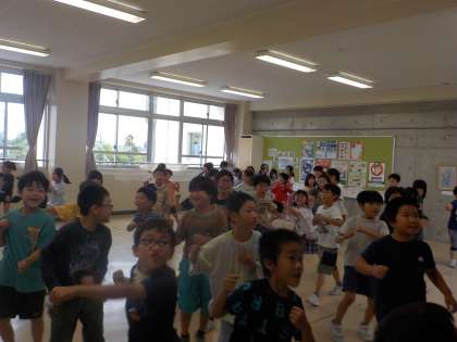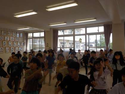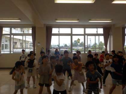 雨の日のパワトレの様子です。学年で2階プレイルームに集まってダンスをしました。笑顔で踊っています。