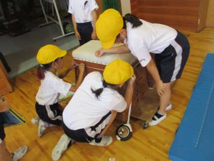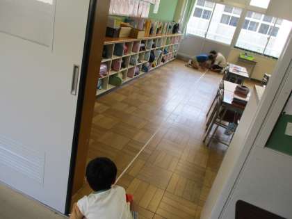 巻き尺を使って、いろいろな物の長さを測りました。巻き尺を使うと、長い物だけでなく、丸みのある物の長さも測ることができ、巻き尺を使うよさに気付きました。