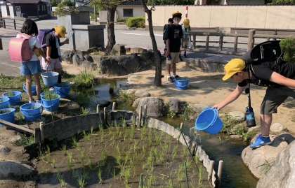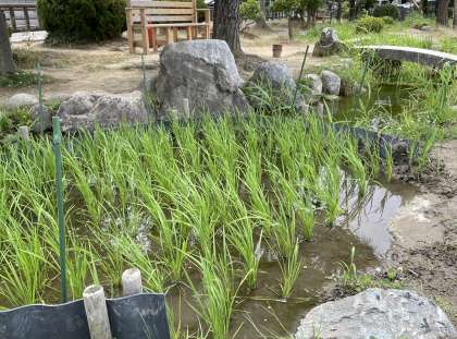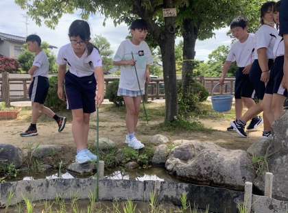 まもなく田植えから1ヶ月が経ちます。登下校時や休み時間等、田んぼの様子を気にかけながら生活してきた甲斐があり、稲はだんだんと大きくなってきました。「周りの田んぼは中干しをしているから、自分たちも早くしたいな」と話す子もいました。成長に合わせて世話するのが楽しみですね。