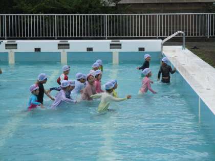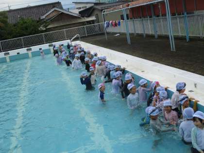 2人ペアをつくり、水をかけ合ったり一緒に線まで歩いたりと水に親しみました。