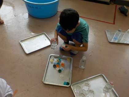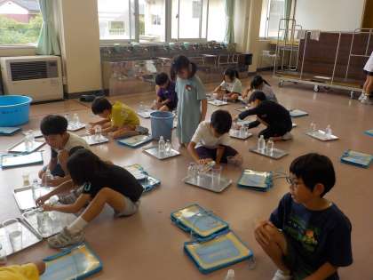 「水のかさを調べよう」の学習では、2つの形の違うペットボトルのかさを調べています。子供たちは多い少ないだけでなく、どのくらい違うのか、どれくらいの量なのかをいろいろな大きさや形のカップを使って調べました。実際に調べてみると、「〇杯分ちょっと」というように半端な数になったり、単位としているカップの大きさがばらばらで分かりにくかったりすることに気づきました。長さのようにみんなの共通の単位が欲しいと話し、よりよい測り方について考えています。