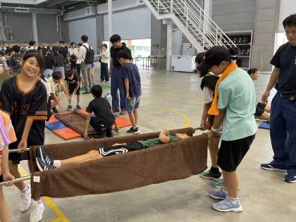 5年生の代表者が、少年消防クラブのイベントに参加しました。車いす体験、担架作成体験、段ボールベッド作成体験、放水体験などを通して、防災について楽しく学びました。