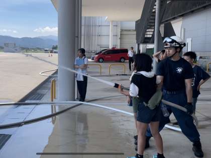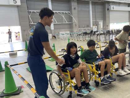 5年生の代表者が、少年消防クラブのイベントに参加しました。車いす体験、担架作成体験、段ボールベッド作成体験、放水体験などを通して、防災について楽しく学びました。