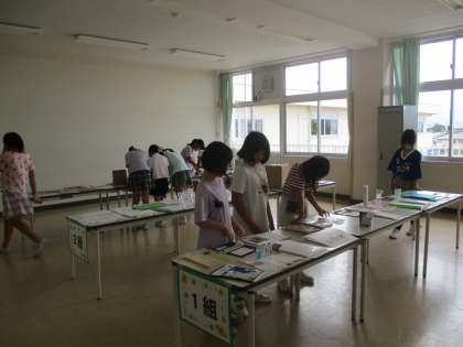 教室前や多目的スペースに1人一研究で頑張った成果が展示してあります。子供たちは友達の作品を楽しそうに鑑賞しています。
