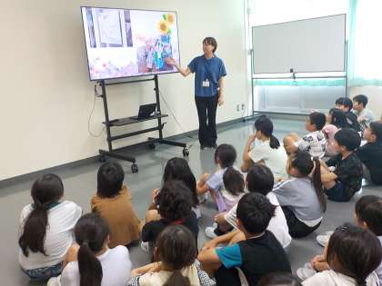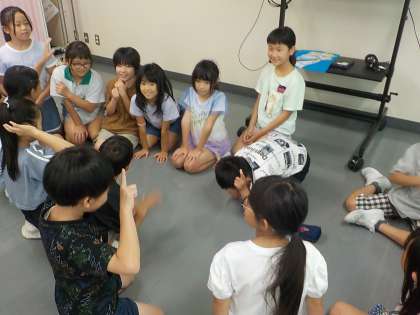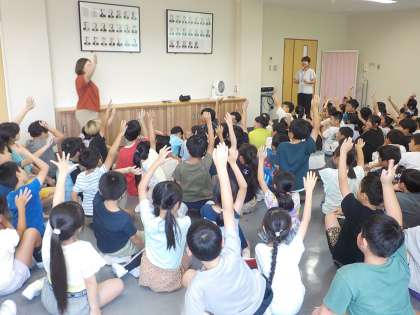 2学期が始まって初めて学年全体で集まりました。2学期の学習や校外学習についての話を聞いたあとは、ジェスチャーゲームで盛り上がりました。最後は、「サザエさん」の曲に合わせて友達と肩をトントンたたき合い、笑顔いっぱいの時間になりました。