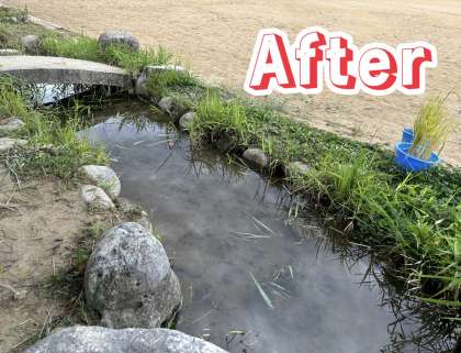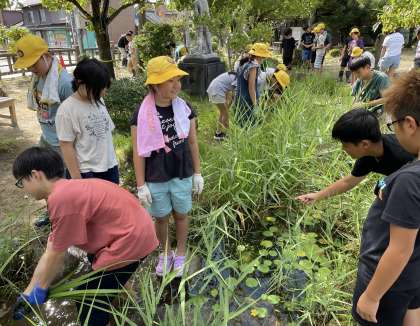 5月に植えた苗はとても大きくなりました。今日は、夏休み中に伸びた雑草を抜き、新庄の森の水田や小川をきれいにしました。みんな短い時間で一生懸命取り組んでいました。