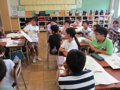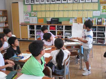 クラスにどんな係があったらよいか、グループで話し合いました。出された意見について質問したり考えを足したりして、グループ全員の意見をまとめていきました。最後に、グループで話し合ったことをクラスのみんなに発表しました。