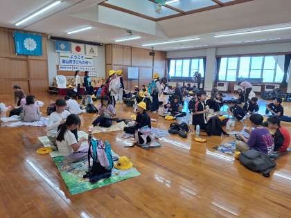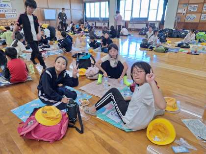 オリエンテーリングの途中、体育室に戻った班がお弁当をいただいています。