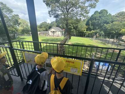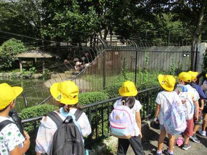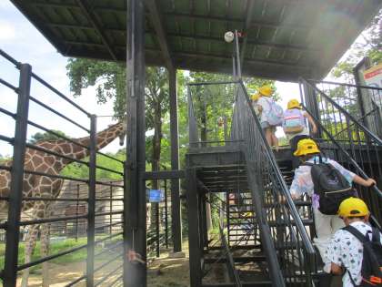 クラスごとに出発した一年生。はじめは、フラミンゴ・しまうま・キリンです。