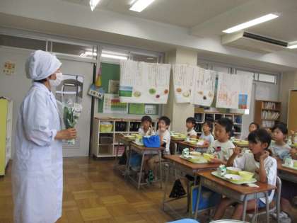 今日の給食のメニューは、小松菜の梅肉和えでした。栄養教諭の堂本先生より、小松菜農家の仕事について紹介していただきました。