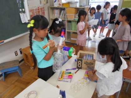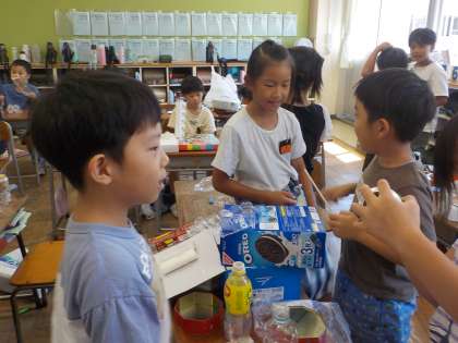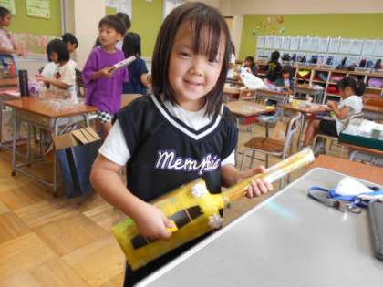 家から持ってきた材料を用いて音づくりに取り組んでいます。作った楽器で友達と演奏する姿も見られました。