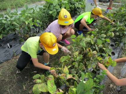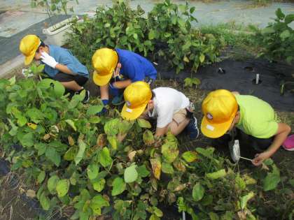 子供たちは今、大豆の栽培に励んでいます。9月に入るとカメムシが大量発生したため、みんなで対策をしました。