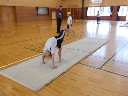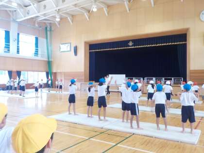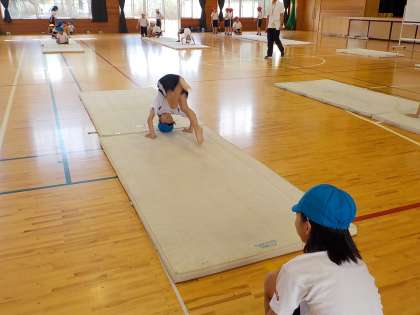 体育科ではマット運動に取り組んでいます。準備体操をしっかりとして「前転・後転・開脚前転・開脚後転」ができるように練習に励んでいます。