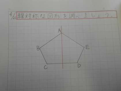 上の写真の五角形は線対称な図形です。それぞれ対応する辺や角を答えましょう。