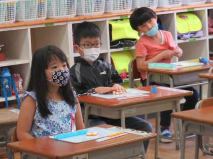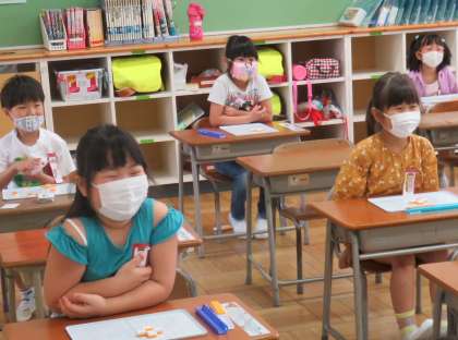 換気や座席に配慮し、分散登校での学習を始めています。