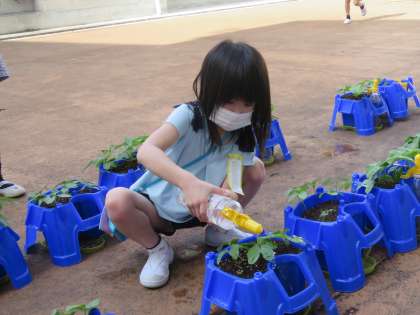 1年生は、朝、登校後の手洗いを終わらせると、中庭のアサガオに水やりをしています。