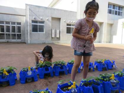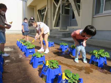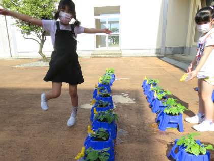 1年生は、朝、登校後の手洗いを終わらせると、中庭のアサガオに水やりをしています。