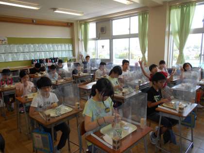 今日久しぶりの給食がありました。パーテーションを設置し、無言の中での給食でしたが、いつもと違う給食のメニューに、小学校生活の長い6年生にとっても、新鮮さを感じた様子でした。