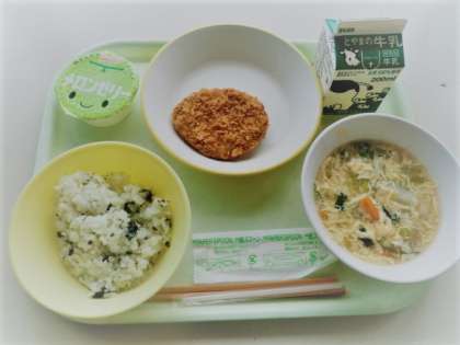 今日の献立は、「牛乳、かきたまスープ、わかめごはん、とんかつ、メロンゼリー」です。