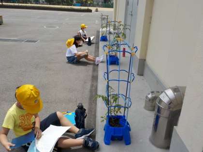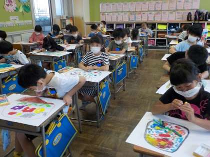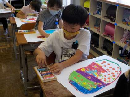 図画工作科「ひみつのたまご」では、模様や色の組み合わせを工夫しながら、世界に一つだけのたまごを描いています。また、生活科や国語科では、野菜の観察をしています。