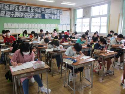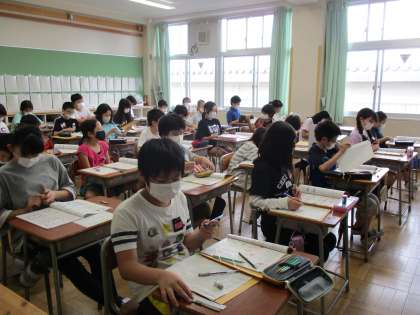 中段:2組 算数科で、分数のわり算の解き方を考えています。