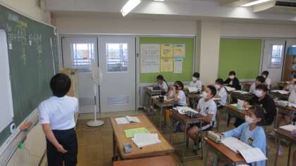 分数のわり算の学習を進めています。計算の仕方を考え、説明することができるようにがんばる6年生です。